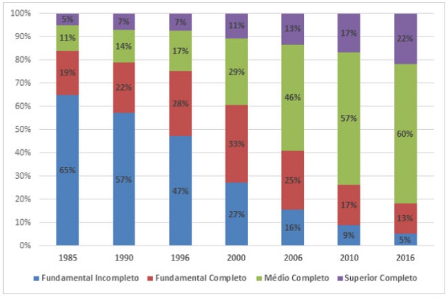 No que diz respeito às mudanças no nível de escolaridade dos trabalhadores, percebemos um aumento significativo, o que tem relação direta com as novas tecnologias e as exigências impostas pelas fábricas reestruturadas. Enquanto na década de 1980 o percentual dos metalúrgicos do Grande ABC que não tinham sequer concluído o ensino fundamental chegava a 65%; em 2016, esse contingente representava apenas 5,0%. Já aqueles com ensino médio completo que perfaziam 11% em 1985, em 2016 chegavam a 60% da mão de obra metalúrgica e, em 1985, apenas 5% possuíam ensino superior. Já em 2016, 22% dos metalúrgicos do ABC possuíam curso superior completo (Gráfico 2).