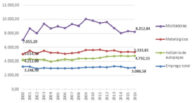O setor automotivo, além de ser o que mais emprega, oferece também os salários mais altos: com média salarial que, em 2016, chegava a 8,2 mil reais, superava em quase três mil reais a média salarial dos metalúrgicos da região (Gráfico 3).