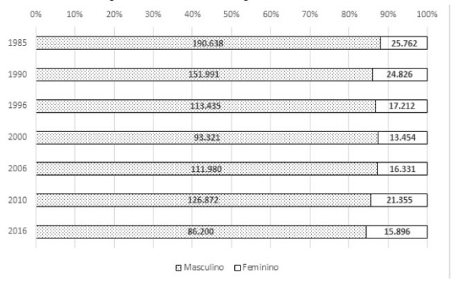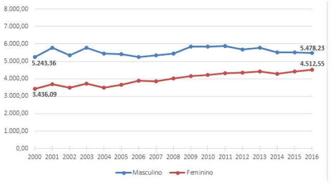 A elevada presença masculina na força de trabalho é outra característica marcante. Apesar de as mulheres terem aumentado sua participação no sindicato e no emprego industrial, o crescimento foi pequeno e, no ano de 2016, representavam apenas 16% do conjunto dos trabalhadores metalúrgicos - em torno de quinze mil trabalhadoras (Gráfico 4). Quando comparamos o ano de 1985 e 31 anos depois, verificamos que ocorreu uma diminuição em termos absolutos, tanto no número de metalúrgicos quanto no de metalúrgicas. No entanto, houve pequeno crescimento em termos relativos: as mulheres representavam, naquele ano, 12% e, em 2016, passaram a representar 16%. Além disso, a média salarial feminina nas empresas metalúrgicas do Grande ABC continua inferior à masculina. No ano 2000, por exemplo, a diferença era de cerca de R$1.800,00, já em 2016, passados dezessete anos, essa diferença caiu um pouco menos de R$1.000,00 (Gráfico 5), mas manteve a defasagem salarial.