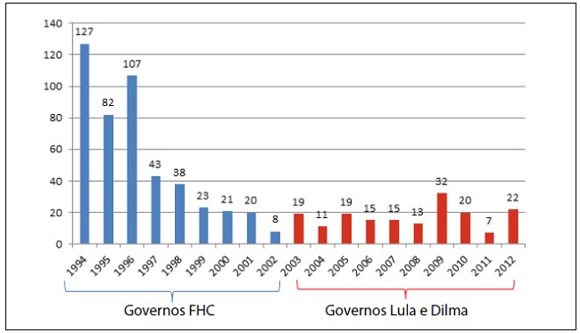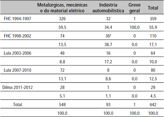Dados referentes ao número de greves ocorridas nos municípios do Grande ABC durante os governos de Fernando Henrique Cardoso (1994-2002), Lula (2003-2010) e nos primeiros dois anos de Dilma (2011-2012), demonstram uma intensa atividade grevista, entre os anos de 1994 e 1996, quando 316 greves ocorrem somente no Grande ABC. Esse período de grande mobilização coincide com o de estabilização monetária, de reestruturação industrial e de ameaças de fechamento e deslocamento geográfico de grandes empresas da região (período também do regime automotivo que estimulou e viabilizou, por meio de incentivos fiscais, a implantação de novas montadoras no país).