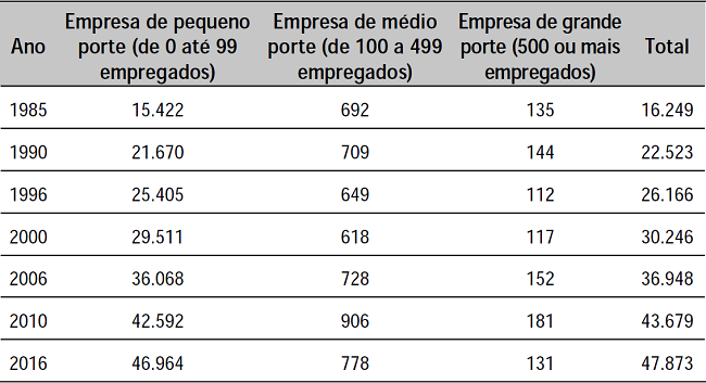 Os dados sobre a região do ABC, referentes às décadas de 1990, 2000 e parte de 2010, permitem identificar avanços e recuos na dinâmica social e econômica regional, 0 o perfil da mão de obra. Entre 1985 e 2016, o número de estabelecimentos de pequeno porte (de 0 a 99 empregados) saltou de 15.422 para 46.964 estabelecimentos. Ao mesmo tempo, a quantidade de empresas de médio e grande porte variou muito pouco; chegam a cair na segunda metade da década de 1990 e crescem a partir de 2005, somando 778 estabelecimentos de médio porte e 131 estabelecimentos de grande porte no ano de 2016 (Tabela 1).