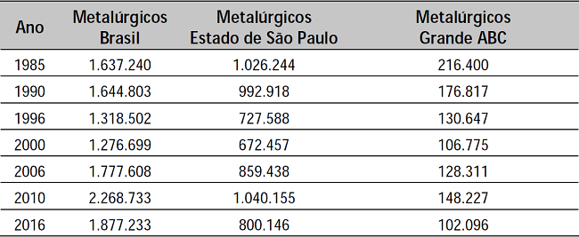 Os dados demonstram uma região industrial em transformação. A categoria metalúrgica se reduziu (de 216.400 operários em 1985, para 102.096 em 2016), mas pode-se constatar uma mudança no perfil, seja em termos de qualificação, seja em termos de escolaridade formal.