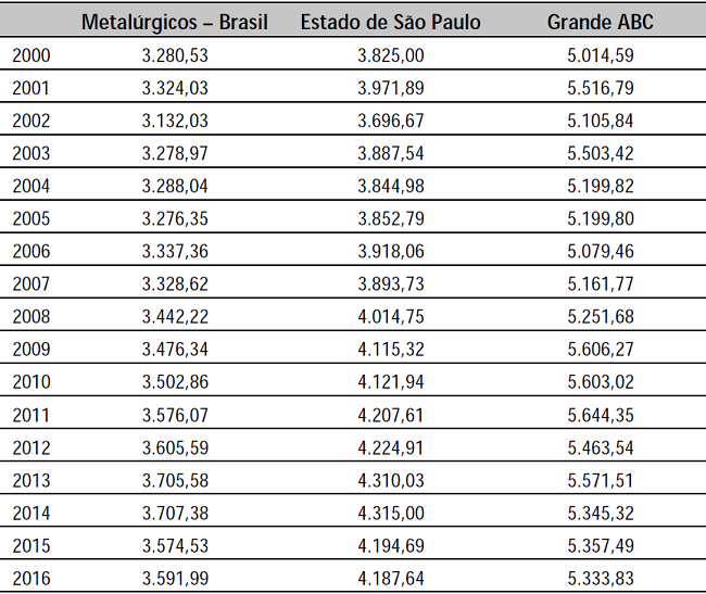A redução no contingente de metalúrgicos, no entanto, não alterou as diferenças salariais com relação à média salarial no estado de São Paulo e no Brasil. A força política e organizacional do sindicato dos metalúrgicos do ABC se confirma nesse quesito e, mesmo com a queda no poder de compra dos salários, no ano de 2016, a média salarial dos metalúrgicos no Grande ABC ultrapassava em mais de R$ 1.700,00 a média brasileira e de quase R$1.200,00 a média do estado de São Paulo (Tabela 3).