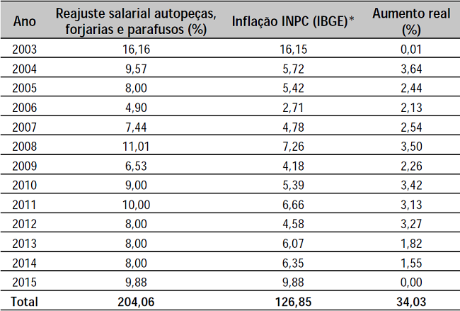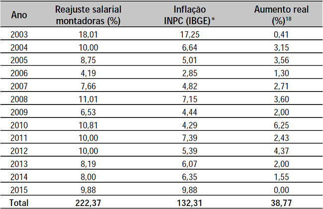 O crescimento das vendas de automóveis no mercado doméstico durante o governo Lula e o primeiro mandato da presidente Dilma Rousseff também fortaleceu o sindicato dos metalúrgicos do ABC durante as negociações salariais17. Desse modo, com exceção de 2015 - quando o mercado já sente os efeitos do desaquecimento da economia - os metalúrgicos conquistaram reajustes em todos os anos, com um aumento real acumulado de 38,7% no caso das montadoras, e de 34,0% no caso das autopeças, conforme as Tabelas 4 e 5.