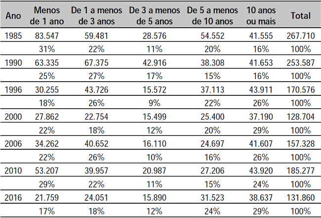 Essa estratégia, combinada com o interesse das empresas em preservar os trabalhadores mais qualificados, tende a contribuir para que haja maior retenção da mão de obra e continuidade dos vínculos. Assim, entre 1985 e 2016, os vínculos de curta duração (ou seja, encerrados com menos de um ano), caem de 31% para 17,0%. Por outro lado, aqueles estabelecidos há dez anos ou mais crescem: no ano de 1985 representavam 16% e, em 2016, eram 29%. Vale dizer que, neste ano, cerca de 1/3 dos trabalhadores metalúrgicos na região estavam empregados em suas respectivas empresas há dez ou mais anos.