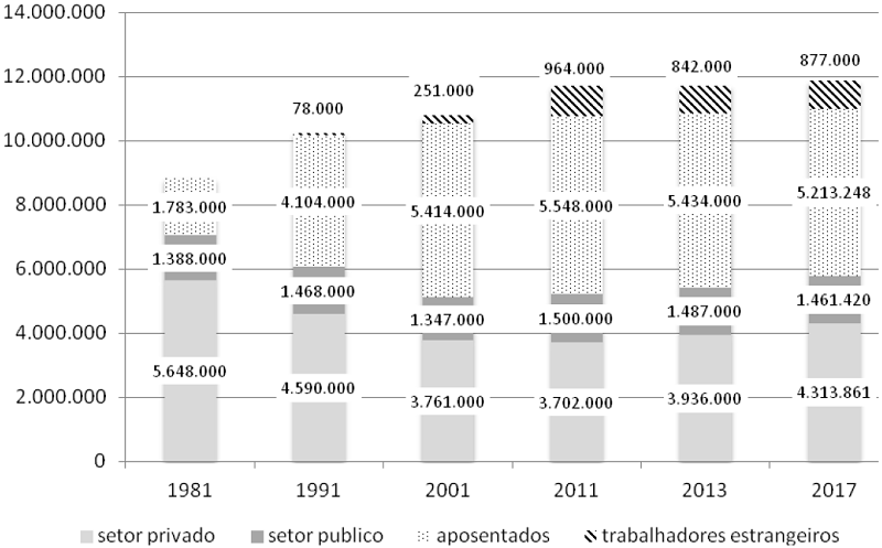 No período analisado, o número de trabalhadores ativos e aposentados é quase equivalente, mas o dado que desperta mais atenção é a redução dos filiados entre os “ativos” do setor privado, se excluirmos os trabalhadores estrangeiros: entre 1981 e 2017, passam de 64% para 36%; já a sindicalização entre os aposentados passa de 20,2% para 43,9%16; há decréscimo entre os empregados do setor público, nesse período, de 15,7% para 12,3%, enquanto os trabalhadores estrangeiros do setor privado passam de 0,8% em 1991 para 7,4% em 2017 (Gráfico 1).