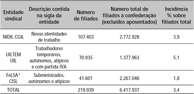 Um indicador que reflete, ainda mais, essa situação crítica do sindicato se refere ao número de filiados nas organizações específicas de categoria (conhecidas como os sindicatos dos trabalhadores atípicos) que cada confederação instituiu há vinte anos para responder ao aumento do emprego precário no mercado do trabalho italiano. O número total declarado em 2017 é pouco mais de 200 mil filiados (Tabela 1) e, se considerarmos o total dos trabalhadores com contrato de trabalho por tempo determinado (quase 2,9 milhões para uma ocupação total na Itália de pouco mais de 23 milhões de trabalhadores no ano de 2017), a taxa de sindicalizado desse segmento é aproximadamente de 7,5%22.