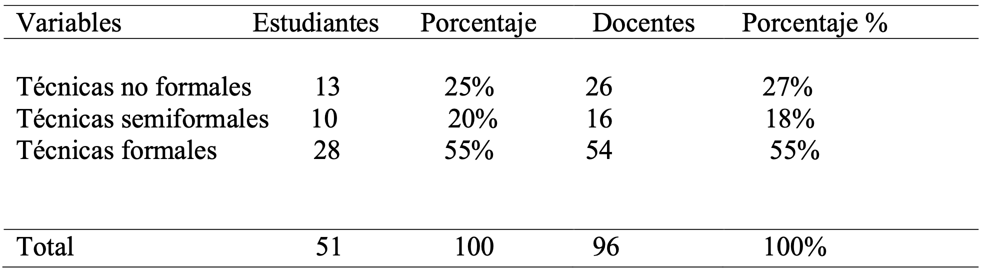Los resultados de la investigación determinan que, de acuerdo con la opinión de los estudiantes, sus docentes nunca aplican técnicas creativas durante las horas de clases, mientras que estos refutaron este criterio y señalaron lo contrario. En lo concerniente a la aplicación de técnicas de evaluación para el desarrollo del aprendizaje, tanto los profesores como los alumnos coinciden en que se utilizan técnicas formales para evaluar como la observación sistemática, exámenes tipo test. Además, emplean técnicas no formales, como conversaciones, diálogos y preguntas de exploración y también técnicas semiformales como ejercicios, prácticas en clase y tareas fuera de casa.
