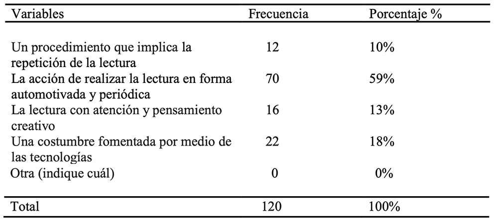 En esta pregunta de la encuesta, un 10% de estudiantes señaló que entiende por hábito lector un procedimiento que implica la repetición de la lectura, mientras que un 59% señaló que lo entiende como la acción de realizar la lectura en forma automotivada y periódica. Para un 13% un hábito lector es la lectura con atención y pensamiento creativo. Finalmente, un 18% sostuvo que se trata de una costumbre fomentada por medio de las tecnologías.
