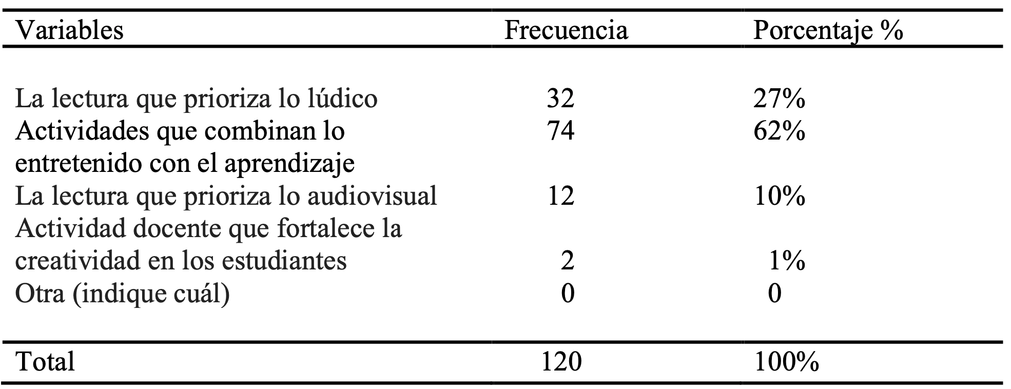 En esta segunda pregunta de la encuesta se consultó a los estudiantes acerca de las características que consideran que debe tener el proceso lector en los niños, niñas y adolescentes. Para un 27% debe priorizarse lo lúdica. Un 62% señaló que se deben emprender actividades que combinan lo entretenido con el aprendizaje. En cambio, para un 10% la lectura debe priorizar lo audiovisual. Finalmente, apenas un 1% señaló que se trata de una actividad docente que fortalece la creatividad en los estudiantes.