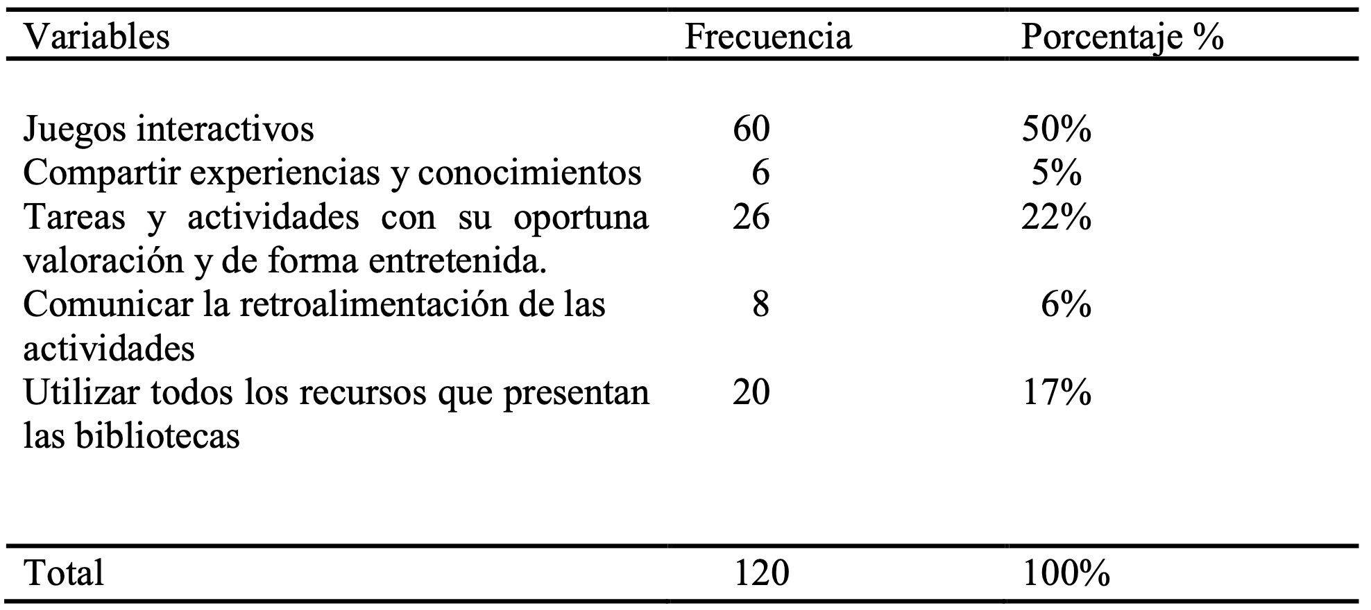 En esta pregunta, los estudiantes identificaron las estrategias que consideran que se deben emplear para fomentar el hábito lector en los niños, niñas y adolescentes en tiempos de pandemia. Para el 50% se deben hacer hincapié en juegos interactivos, en cambio para un 5% se deben compartir experiencias y conocimientos, mientras que para un 22% se deben realizar tareas y actividades con su oportuna valoración y de forma entretenida. Un 6% opinó que se debe comunicar la retroalimentación de las actividades. Finalmente, un 17% que una estrategia exitosa tendría que utilizar todos los recursos que presentan las bibliotecas.