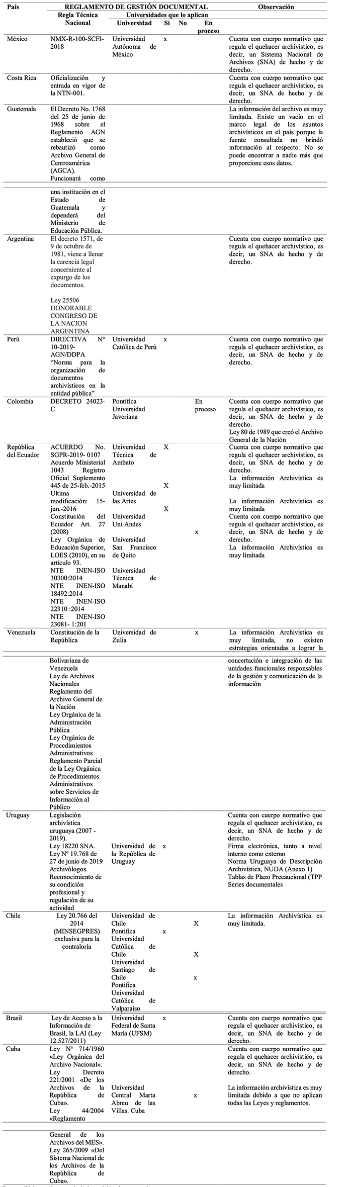 Abstract: The objective of this study is to analyze the trend of Document Management in Latin American universities and its basis in the requirements of the UNE-ISO15489 standard. The indicators of this standard constitute a means to respond to the needs related to the administration, management, generation and flow of documents, as well as the permanence of the archival documents over time, in addition to gradually incorporating the different activities and regulating the practices carried out, both by those responsible for their management and by any other person who creates or uses documents in the exercise of their functions. A descriptive study was carried out, using the method of documentary analysis in the review of the theoretical assumptions and in the assessment of the regulations applied by 12 countries in the region. Among the results, it stands out that there are still shortcomings in Latin American universities since not all of them have developed a project for the consolidation of a Document and Archives Management System. It is concluded that there is still a need for universities to strengthen knowledge about documentation management, apply more rigorously the legislation of the countries at the three levels that are presented: laws of the national archive or general archive of the Nation, laws of character specific and the laws of the National Archives System in each country.