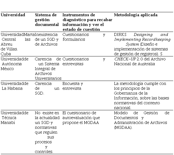 Dando cumplimiento al objetivo de fundamentar de forma teórica el tratamiento documental en los archivos de gestión de las dependencias administrativas universitarias, se filtró algunas investigaciones realizadas a universidades de Latinoamérica donde se han realizado diagnósticos para determinar la existencia de Sistemas de Gestión Documental y Normativas que regulen sus procesos y controles de la información generada durante las actividades administrativas, académicas y sociales en los centros universitarios.