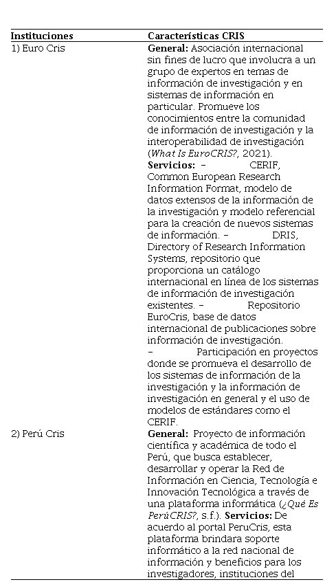 • Perú Cris un proyecto base para la producción científica de la región de Latinoamérica, que promete consolidar información digital de datos científicos, técnicos y de innovación tecnológica. Los ejes de trabajo son investigadores, instituciones de estado y empresa en general. En cuanto a documentación y/o normativa cada una se desarrolla en colaboración con instituciones públicas y privadas que realizan actividad de ciencia, tecnología e innovación. Además presenta enlaces de direccionamiento a sistemas CRIS a nivel nacional e internacional, herramienta que permita conocer información sobre cada una de ellas y sus lineamientos.