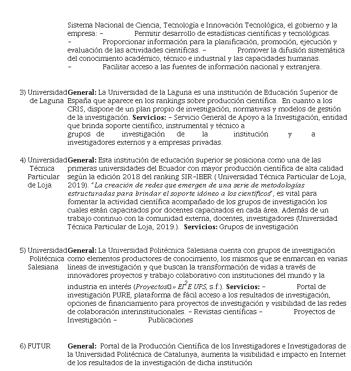 • La Universidad Politécnica Salesiana evidencia un CRIS general informativo a diferencia de las instituciones tipo estudiadas.