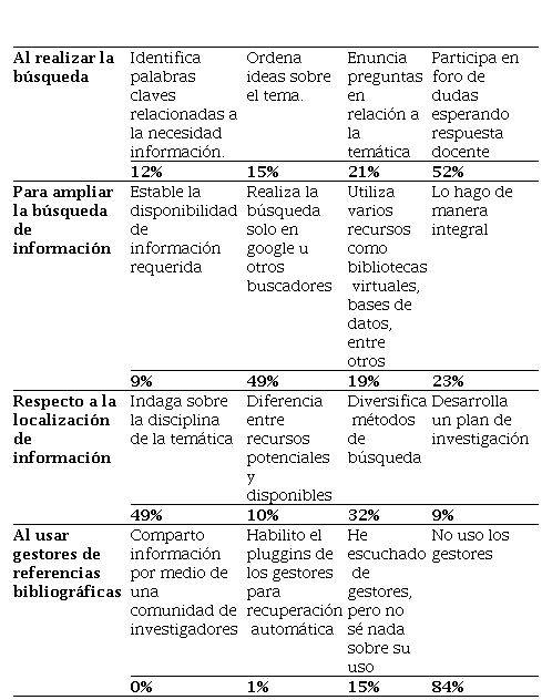 En cuanto a las interrogantes y planteamiento de situaciones experienciales¸ se presentan los resultados en atención a las dimensiones: búsqueda de información y recuperación, evaluación de la información, y uso de la información. Al realizar la búsqueda los encuestados mayoritariamente (52%) participan en foro de dudas para lograr una respuesta por parte del docente. Para ampliar la información se conforman con la búsqueda que realizan en google u otro buscador (49%), desperdiciando las bondades de herramientas diferentes. En la tabla 4 igualmente se evidencia el sesgo a localizar información indagando únicamente sobre la disciplina de la temática (49%). Al interrogarlos sobre gestores de referencias bibliográficas, el 84% de la muestra estudiada no los utiliza.