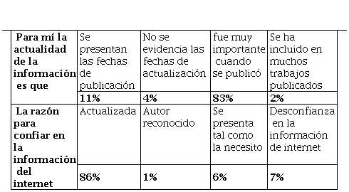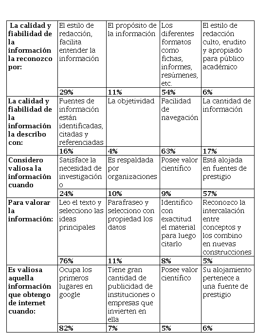 La evaluación de la información, en términos de la calidad, valoración y confianza de la información obtenida, se encontró que los usuarios presentan un alto grado en el reconocimiento de la información bajo los elementos mencionados. Sin embargo, la selección de información preferiblemente se concreta por la abundancia de los resultados y por el tema. En este sentido, y de acuerdo con Bonilla