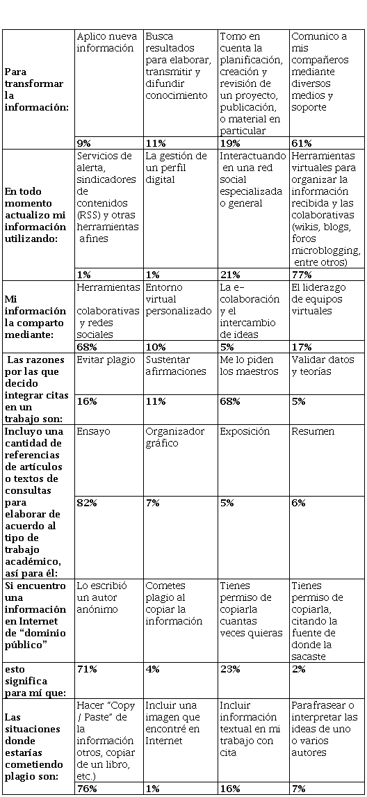 En atención a la dimensión uso de la información, en la tabla 6 se evidencia que para transformar la información el 61% de la muestra manifiesta realizarla mediante la comunicación a sus compañeros por diversos medios y soportes. La actualización de la información es ejecutada por medio de herramientas virtuales colaborativas que le permita su organización (77%), herramientas con las cuales comparte preferentemente dicha información (68%). Un resultado que llama la atención es el utilizar citas solo sí le es solicitado por el docente (68%) y no para respetar el derecho de autoría o sustentar afirmaciones. Igualmente, el uso de referencias es considerada por la muestra estudiada mayoritariamente en la realización de ensayos (82%), subestimando su uso en otras producciones intelectuales. Existe un desconocimiento del significado de información de dominio público, por cuanto el 71% lo asume como algo escrito por un autor anónimo y no como una producción que puede ser utilizada por todos, ya que no están protegidas por el derecho de autoría. Los sujetos de la investigación en un porcentaje alto (76%), solo consideran como plagio el “Copy / Paste”. Resalta acá, que para ellos el incluir una imagen de internet sin referencia a su autor no es plagio (1%).