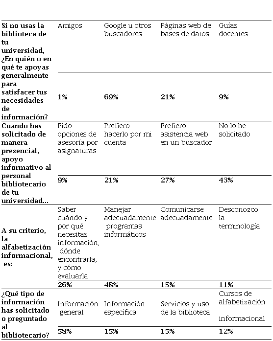 Al preguntar sobre la experiencia en solicitud de asesoría informativa, en la tabla 7 se evidencia que un 69% de los encuestados afirman apoyarse en los buscadores web preferiblemente google para satisfacer sus necesidades de información. Como segunda opción recurren a las bases de datos. En relación a la acción que ha seguido al solicitar apoyo informativo presencial en la universidad, mayoritariamente no lo han necesitado (43%). Lo cual es lógico por las condiciones en las cuales se ha desarrollado su proceso de formación en estos tiempos de confinamiento producto de la COVID19. Es preocupante que solo un 26% de los estudiantes saben lo que significa la alfabetización informacional, lo cual indica la existencia de necesidades de formación en esta área. Esto es confirmado cuando apenas un 12 % está interesado en cursos de alfabetización informacional.