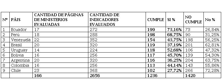 Como se puede observar, de los 9 países analizados de América Latina, en relación a la cantidad de páginas de sus ministerios evaluadas (166 páginas), aplicando el instrumento (16 indicadores), en porcentaje de grado de cumplimiento, el primer grupo de países que aplican el gobierno electrónico son: Ecuador, Perú y Venezuela; en un segundo lugar: Brasil, Uruguay y Bolivia y; por último: Argentina, Colombia y Chile.
