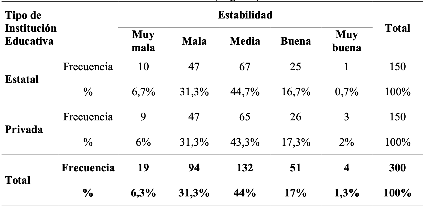 En cuanto a los estudiantes de instituciones educativas estatales, el 44,7% presentan una estabilidad familiar a nivel medio, el 31,3% refieren una estabilidad familiar mala, el 16,7% indican buen estabilidad, el 6,7% se sitúan en muy mala estabilidad familiar y tan solo el 0,7% demuestran un nivel muy bueno, valores que al comparar con los niveles que ofrecen los estudiantes de instituciones educativas privadas, no refieren gran diferencia, por cuanto el 43,3% de estudiantes evaluados de instituciones privadas presentan una estabilidad familiar en niveles medios, el 31,3% se ubican en niveles malos, el 17,3% refieren una estabilidad familiar buena, el 6% se sitúan en niveles muy malos mientras que el 2% refieren muy buena estabilidad familiar, lo que se traduce que la estabilidad familiar mantiene un comportamiento singular para estudiantes de diferentes instituciones educativas.