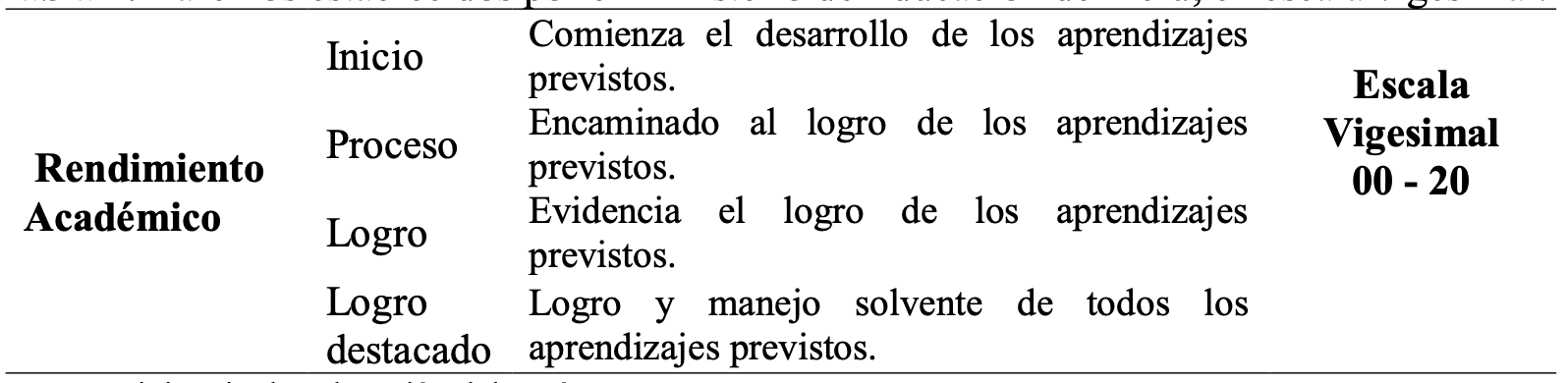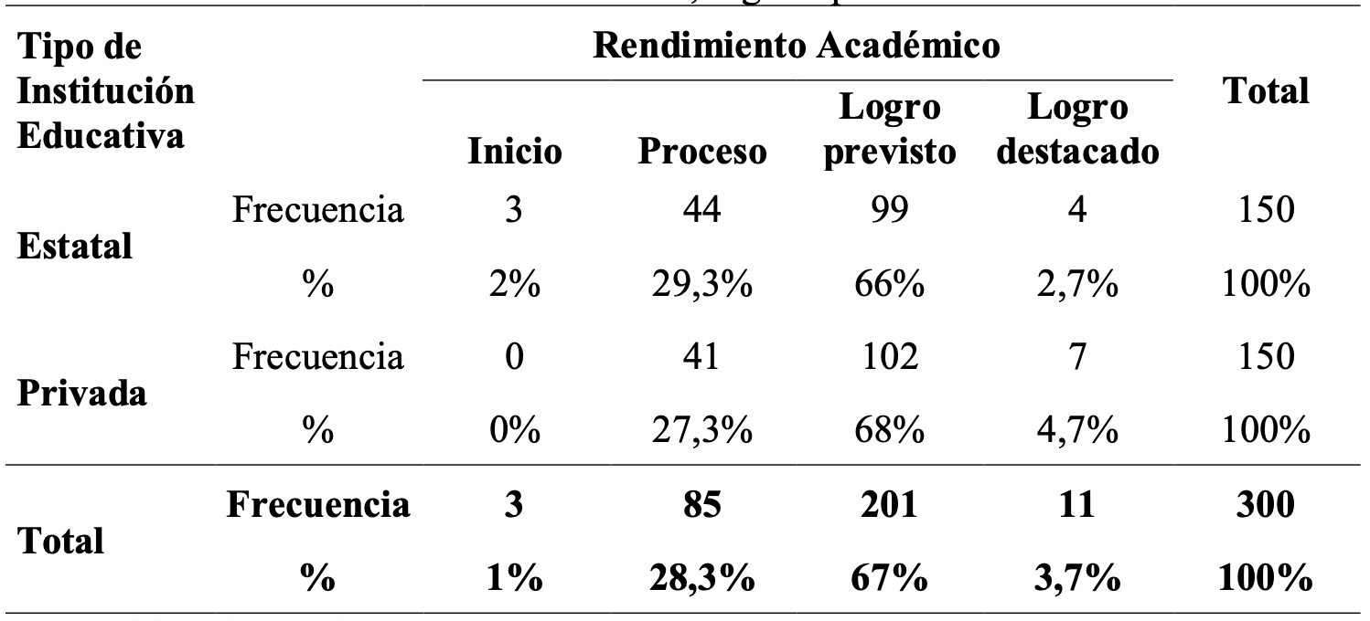 Particularmente por institución educativa se observa que el 66% de los estudiantes de instituciones públicas refieren un rendimiento académico de logro previsto, el 29,3% refieren un rendimiento académico en proceso, el 2,7% reportan un rendimiento académico destacado y tan solo el 2% se encuentran en inicio, mientras que el 68% de los estudiantes provenientes de instituciones educativas privadas reportan un rendimiento académico en niveles previstos, el 27,3% se ubican en proceso, y el 4,7% refieren un rendimiento académico destacado, sin reportar ningún estudiante en inicio. Prácticamente el rendimiento académico de los estudiantes reportado por las instituciones educativas no difiere en cuanto a su progreso se refiere.