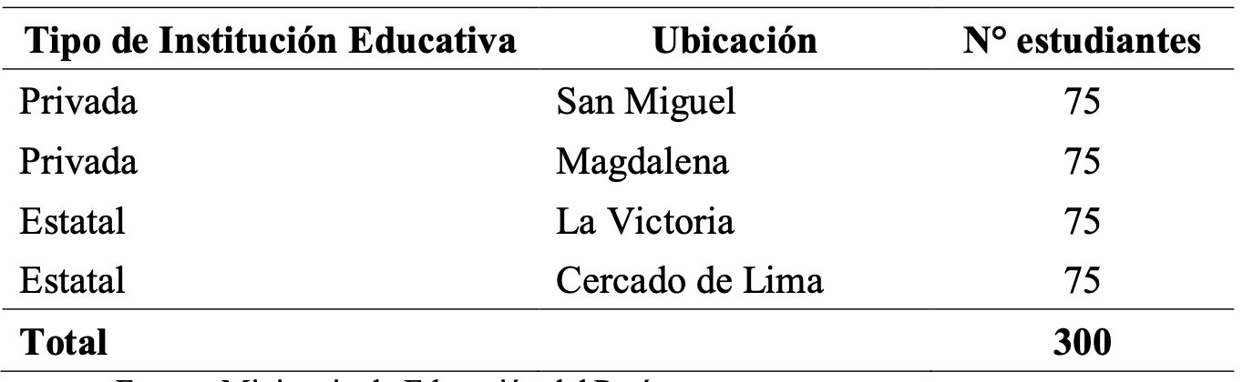 Se analizaron datos de 300 estudiantes de Quinto Año de Secundaria pertenecientes al año lectivo 2018; los padres de familias y directores de las diferentes Instituciones Educativas.