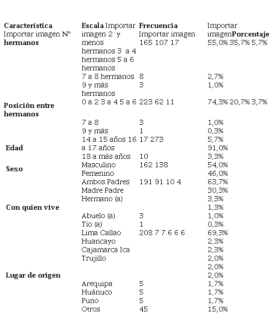 En cuanto a las edades que presentan los estudiantes, los datos muestran que el 91% tienen una edad entre 16 a 17 años; conforme al sexo en los estudiantes evidenciamos una proporción bastante ajustada, con una leve elevación en el sexo masculino 54% con respecto al sexo femenino 46%; los resultados también muestran que el 63,7% de los estudiantes viven con ambos padres, mientras que un número considerable vive tan solo con uno de ellos, el 30,3% viven solo con la madre; además se observa que el 69,3% de los estudiantes son naturales familiarmente de la ciudad de Lima, con proporciones muy bajas en otras regiones como el Callao y Huancayo que representan el 2,3%, Cajamarca, Ica y Trujillo representan el 2%, mientras que Arequipa, Huánuco y Puno infieren el 1,7%. Estos resultados tienen relevancia desde el plano educativo y social, porque permiten conocer la problemática del clima familiar de los estudiantes, ayudando tanto a los padres de familia como a los directivos de las diversas instituciones educativas a tomar conciencia sobre la vital importancia del clima familiar para el aprendizaje integral del estudiante.