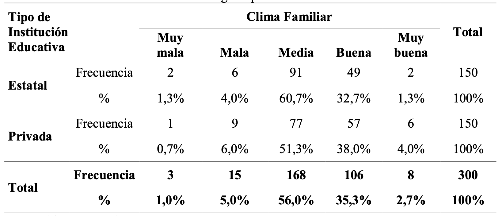 De igual manera se observan los resultados en cuanto a la variable clima familiar según tipo de institución educativa, donde se evidencia que el clima familiar en el 60,7% de los estudiantes de las instituciones estatales presentan niveles medios, el 32,7% se encuentran en buenos niveles, el 4% presenta un mal nivel, y el 1,3% se ubican en niveles muy bueno y muy malo, mientras que el clima familiar en el 51,3% de los estudiantes de instituciones privadas se encuentran en un nivel medio, observando que el 38% de este grupo se encuentran en nivel bueno, el 6% presenta un mal nivel, el 4% refiere un muy buen nivel de clima familiar y el 0,7% contempla un nivel muy malo.