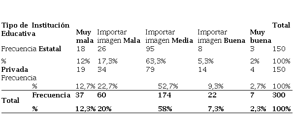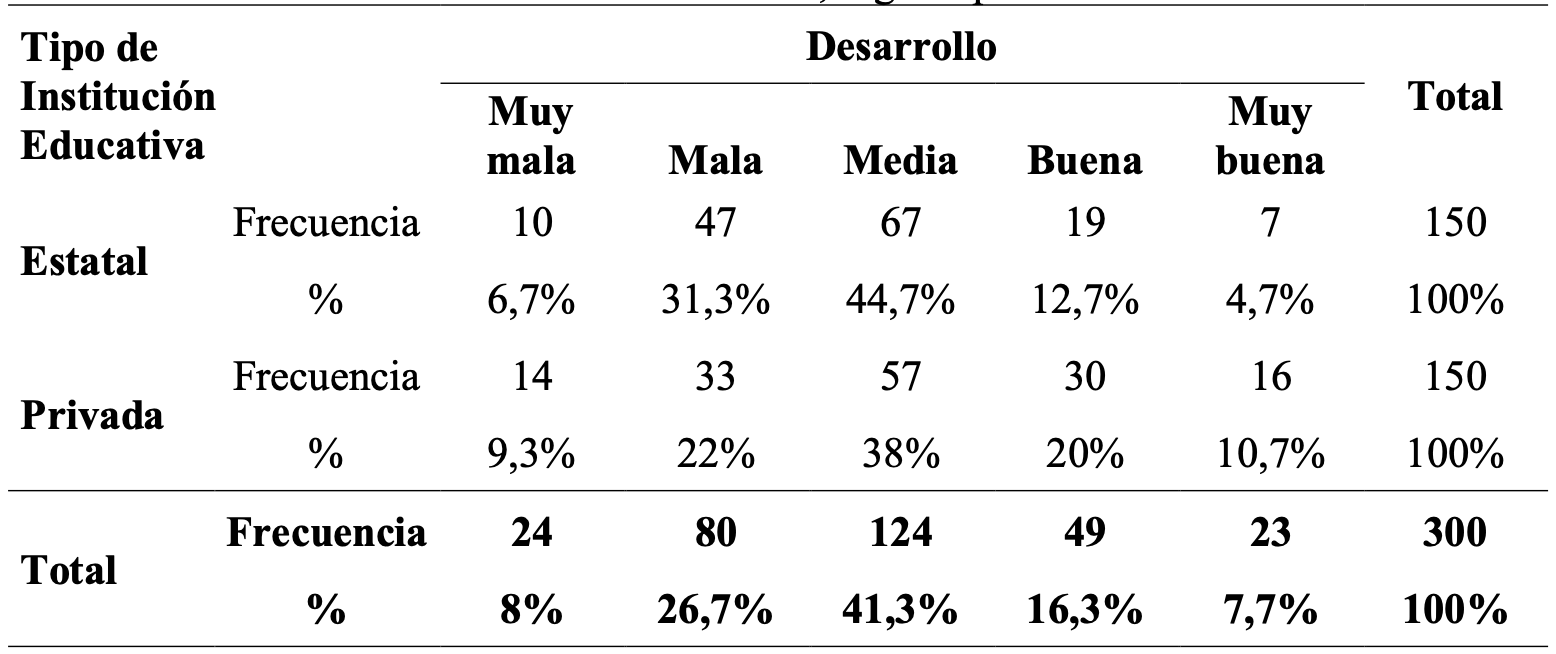 En la Tabla 4 se presenta el análisis estadístico de los 300 estudiantes evaluados en instituciones educativas privadas y estatales de Lima, Perú.