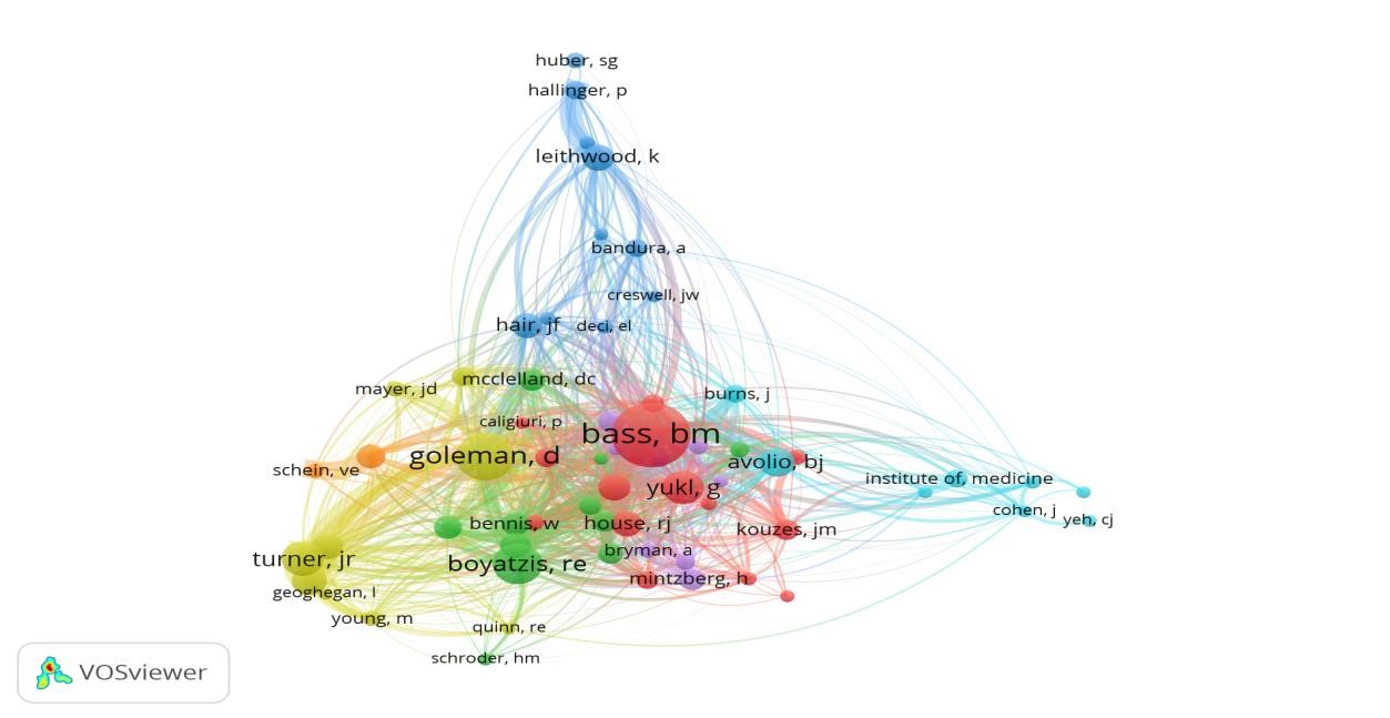 Primero, para poder visualizar a los autores más influyentes sobre los 333 documentos identificados en esta revisión bibliométrica, la Figura 1 expone el análisis de co-citación de autores considerando aquellos que se les ha citado por lo menos diez veces. Es así como Bass, Goleman, Boyatzis, Turner, Yulk, Leithwood y Avolio resultan ser los autores destacados dentro de las publicaciones aludidas al tema de competencias de liderazgo, encontrándose estos en cinco de los siete campos de investigación abordados.