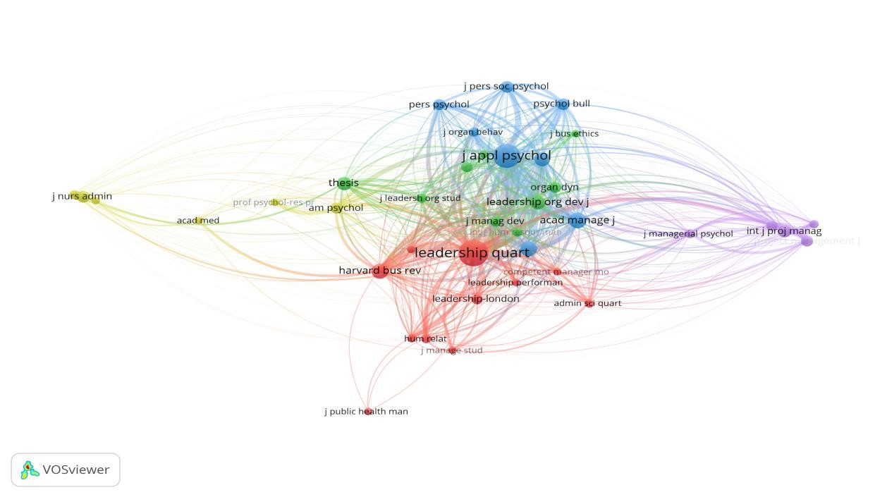 En segundo lugar, se presenta en la Figura 2 el mapa de co-citación por fuente de publicación, el cual incluye a las fuentes que fueron citadas al menos 20 veces. En este caso, se puede contemplar que los journals más influyentes en los documentos resultantes de este estudio, los cuales están distribuidos en cinco agrupaciones de campos abordados, son: Leadership Quarterly, Journal of Applied Psychology, Harvard Business Review, Academy of Management Journal, International Journal of Project Management, y Academy Management Review.