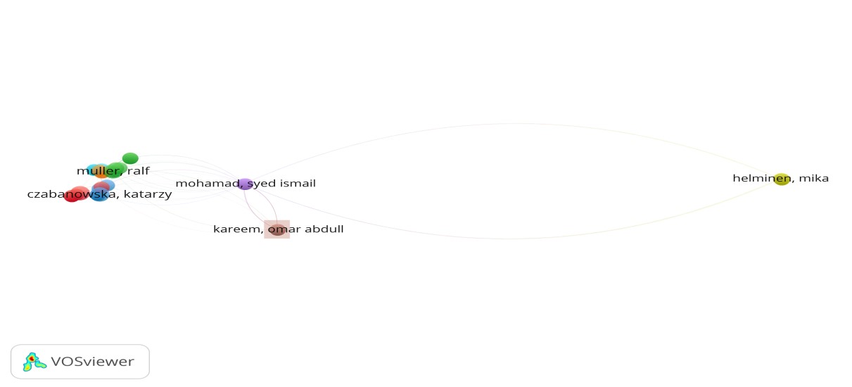 A continuación, el análisis de acoplamiento bibliográfico por autor mostrado en la Figura 3 se elaboró incorporando a los autores que tienen como mínimo dos documentos publicados. Como resultado, este mapa muestra aquellos autores cuyos documentos tienen una o más referencias en común, los cuales se encuentran en ocho campos de estudio diferentes. Con esto, se puede ver la cercanía entre los trabajos de Czabanowska, Guerrero, Wainio, Stoller y Sherma, así como en las publicaciones de Muller, Prochazka, Trivellas y Turner.