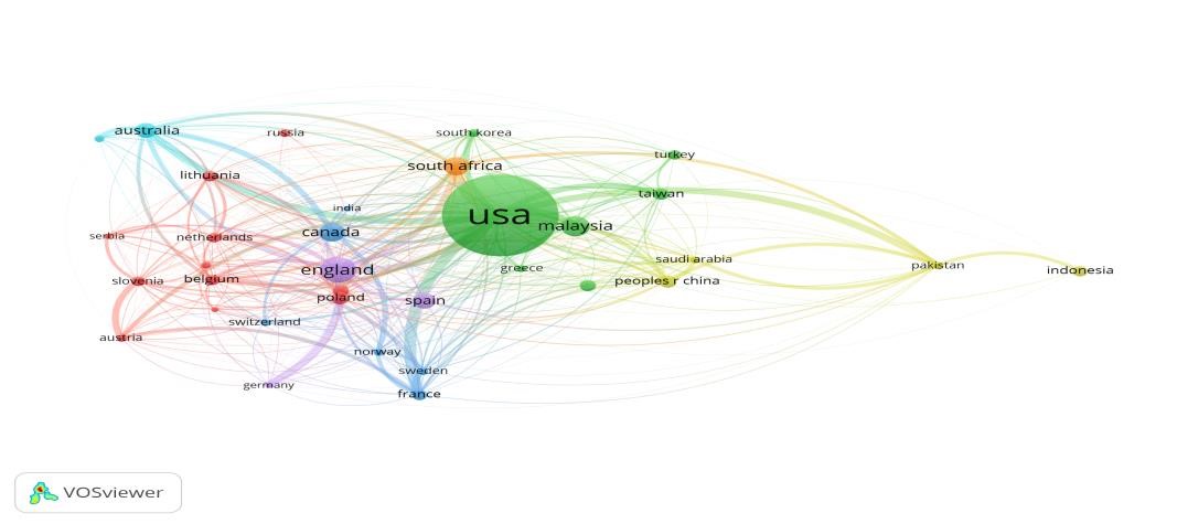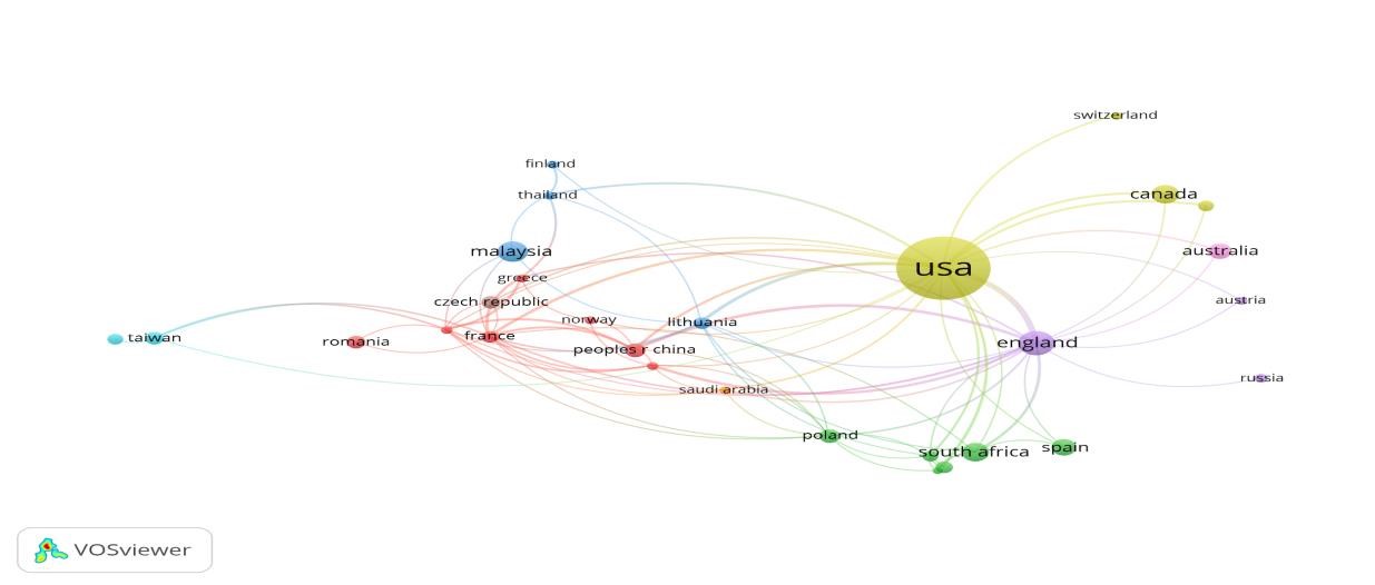 En la Figura 7 se ostenta la citación por país abarcando aquellas naciones con al menos tres documentos publicados. De ahí, se observan ocho campos de investigación y se reconoce a Estados Unidos como el país con mayor número de documentos citados, siendo Inglaterra, Malasia, Sudáfrica, Canadá, Australia y España los países seguidores.