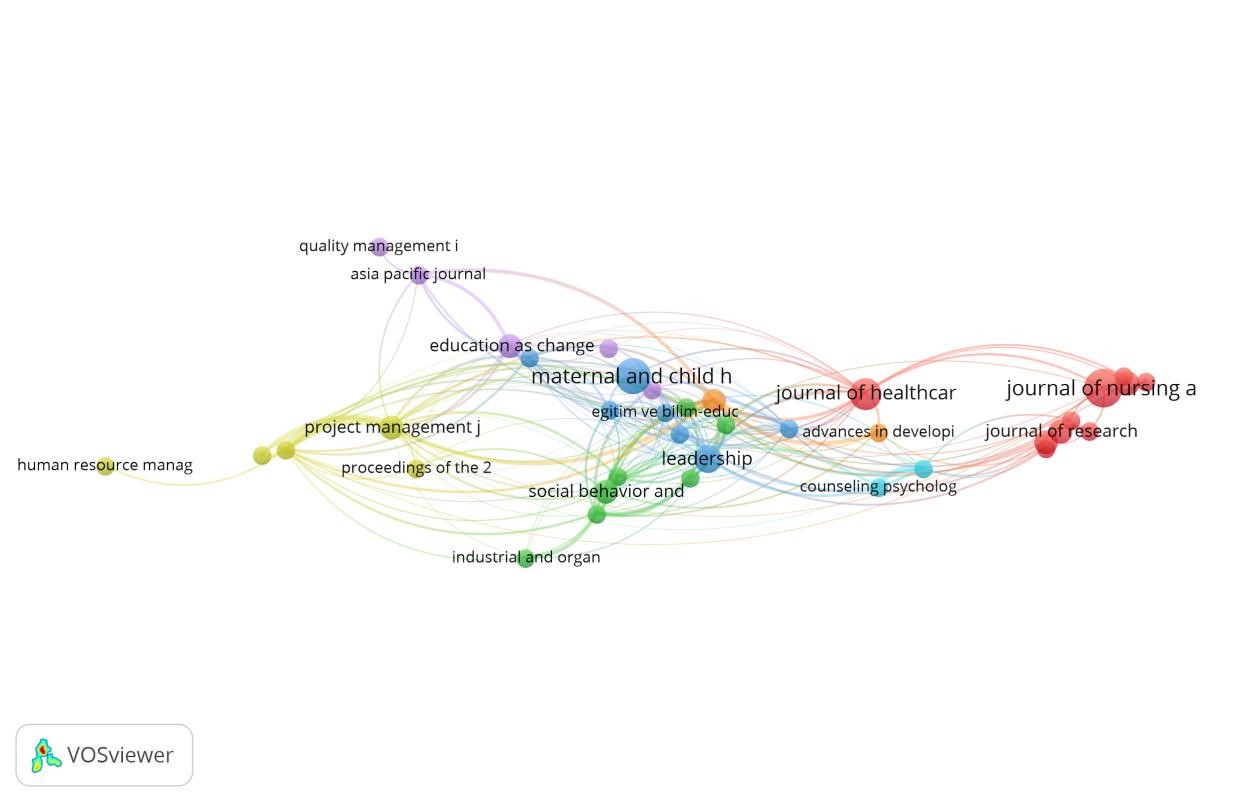 En la Figura 5 se muestra el análisis de acoplamiento bibliográfico por fuente de publicación, integrado sólo por aquellas fuentes con dos publicaciones como mínimo. De esta manera, el mapa revela los journals con una o más referencias en común, apareciendo Journal of Nursing Administration, Maternal and Child Health Journal y Journal of Healthcare Management como las fuentes de mayor acoplamiento; estas, se encuentran en siete campos de estudio y la correspondencia entre ellas es muy semejante. Es pertinente recordar que estas tres revistas son las que han aportado mayor número de publicaciones a la línea de investigación de competencias de liderazgo.