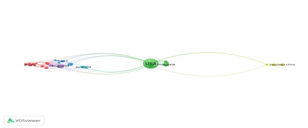 Adicional a los análisis anteriores y con el propósito de distinguir la colaboración entre países, se revisó la coautoría por país incluyendo aquellos países con al menos tres documentos publicados. Dicho análisis se exhibe en la Figura 6, notándose que Estados Unidos es el país que colabora más en la labor investigativa, estando Inglaterra, Malasia y China como subsiguientes en la lista. De modo similar, se tienen seis campos de investigación y los países sobresalientes pertenecen a grupos diferentes. Para este caso, el tamaño del círculo simboliza la cantidad de documentos en coautoría.