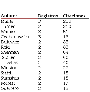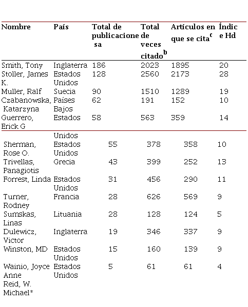 De igual forma, con el propósito de identificar la productividad total por autor, es conveniente adicionar los documentos de otras temáticas para tener la perspectiva global con respecto al autor en esta base de datos. Por ello, en la Tabla 11 se proveen los datos sobre la trayectoria en publicaciones en WoS de los catorce autores, así como la popularidad de sus trabajos. De ahí se aprecia que Tony Smith encabeza la lista en cuanto a volumen de producción con 186 registros, los cuales tienen 2023 citaciones. No obstante, James K. Stroller con menor cantidad de escritos ha logrado mayor número de citación, esto es 2560 citas de 128 investigaciones.