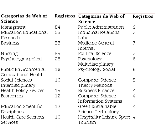 El último indicador de productividad con base en el parámetro de volumen de producción abarcado en este análisis bibliométrico es respecto a las categorías dentro de la base de WoS, las cuales se muestran en la Tabla 12. Para esto, se tomaron en cuenta únicamente las categorías con cuatro publicaciones o más. Es así como se aprecia que las categorías en las cuales se encuentra el mayor número de registros son Management con 25% y Education Educational Research con 16%.
