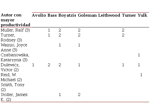 Finalmente, al hacer el cruce de información de los autores con mayor productividad y los datos del análisis de co-citación por autores se obtiene la Tabla 13. En ella, se despliegan los autores más influyentes que fueron citados por los investigadores. De esta manera, los números en las columnas muestran la cantidad de registros en los que el autor con mayor productividad citó al autor más influyente. Por otro lado, el número parentético a lado del nombre del autor es el total de publicaciones dentro de los documentos identificados en este estudio bibliométrico de la línea de competencias de liderazgo. De ahí que, el autor que cita a mayor número de autores influyentes es Victor Dulewicz, y el autor influyente mayormente citado es Boyatzis. En ese mismo orden de ideas, el autor que cita a menor número de autores influyentes es W. Michael Reid, y el autor influyente menos citado es Leithwood.