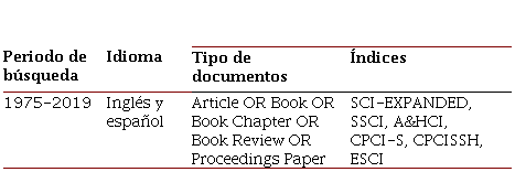 En la primera parte de la metodología, es decir la búsqueda de la información, se ejecutaron tres actividades. Primero, se seleccionó la base de datos WoS del Grupo Editorial Thomson Reuters por su alto nivel académico y su accesibilidad (Casses et al., 2016). El segundo paso fue la definición de la ecuación de búsqueda con la etiqueta de campo de título. En este sentido, la ecuación de búsqueda definida para esta revisión bibliométrica fue TI=("leadership AND competenc*").