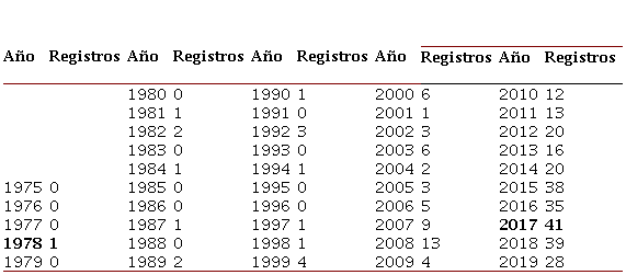 Es importante considerar que esta revisión bibliométrica incluye publicaciones del año 2019 hasta el mes de octubre, fecha en que se llevó a cabo el presente trabajo. Esto implica que la cantidad de documentos de este año pudiera incrementar. Bajo tal consideración, se tienen 333 registros en la base de datos WoS sobre el tema de competencias de liderazgo entre los años 1975 y 2019, siendo en 1978 cuando se concretó la primera publicación.