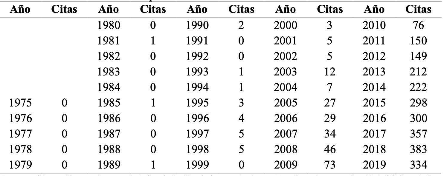 En los resultados obtenidos en esta bibliometría, se puede dividir el análisis de la citación en dos periodos: (1) del año 1978 a 1999, y (2) del año 2000 a 2019. En el primer periodo la citación fue prácticamente nula, dado el promedio de una cita por año. Esto podría crear la idea que la productividad en citas fue baja o muy baja. Pero, al comparar este dato con la producción de publicaciones en ese mismo periodo, la perspectiva puede cambiar; pues el promedio de documentos está por debajo de la unidad. En lo que toca al segundo periodo, el panorama es totalmente diferente porque el promedio anual de citas es de 136 y el de documentos producidos es de casi 16. Dado dicho incremento en la citación, se puede afirmar lo aportado por Huang (2016) y Larivière y Costas (2016) que, a mayor número de publicaciones, la calidad de éstas también tiende a incrementarse.