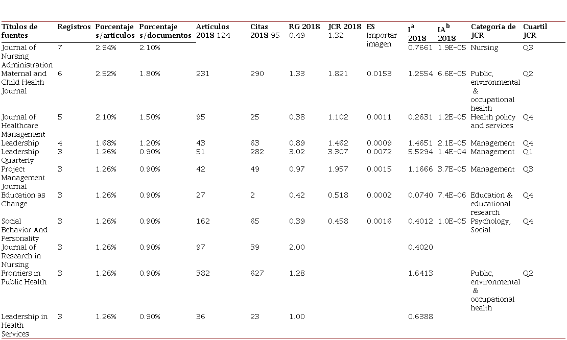 El tercer indicador denominado en este estudio es concerniente a la producción por fuente de publicación, enmarcando aquellas fuentes que tienen tres o más publicaciones. Como se vio en la Tabla 4, los registros obtenidos en esta bibliometría básicamente son del tipo de documento article . proceedings paper. Acorde a ello, en la Tabla 5 se presentan los journals con los siguientes índices del año 2018: Factor de Impacto de Research Gate (RG), Journal Citation Report (JCR), Eigenfactor Score (ES), Inmediatez (I) e Influencia del Artículo (IA). Así mismo, se muestra la categoría y el cuartil en JCR al que pertenece el journal. Allí se distinguen Journal of Nursing Administration y Maternal and Child Health Journal al haber publicado 2.1% y 1.8% de los documentos identificados en esta búsqueda, respectivamente.