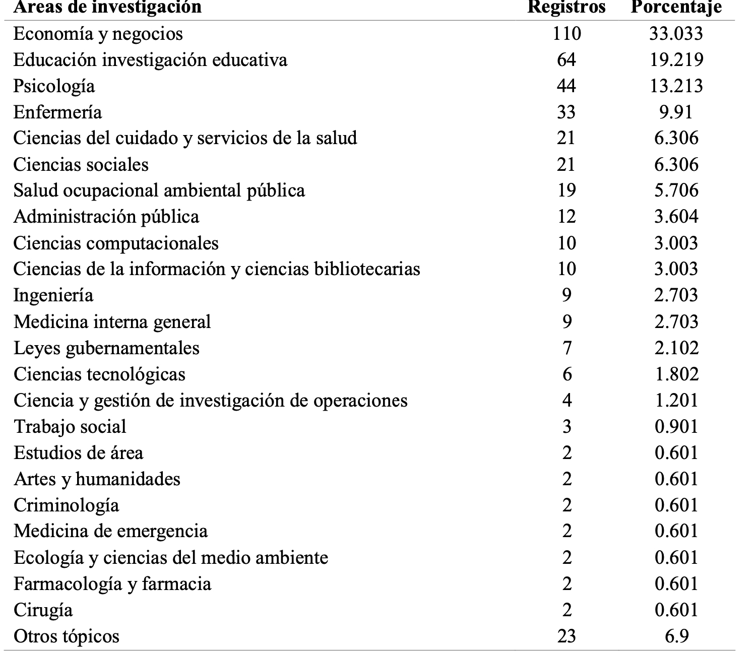 El siguiente indicador de productividad que se obtuvo a través de este análisis está relacionado con el área de investigación (Tabla 7). El área de Economía y Negocios es el mayor generador de producción científica en el tema de competencias de liderazgo abarcando más del 33%, seguida de lejos por Educación y Psicología con 19% y 13% respectivamente.