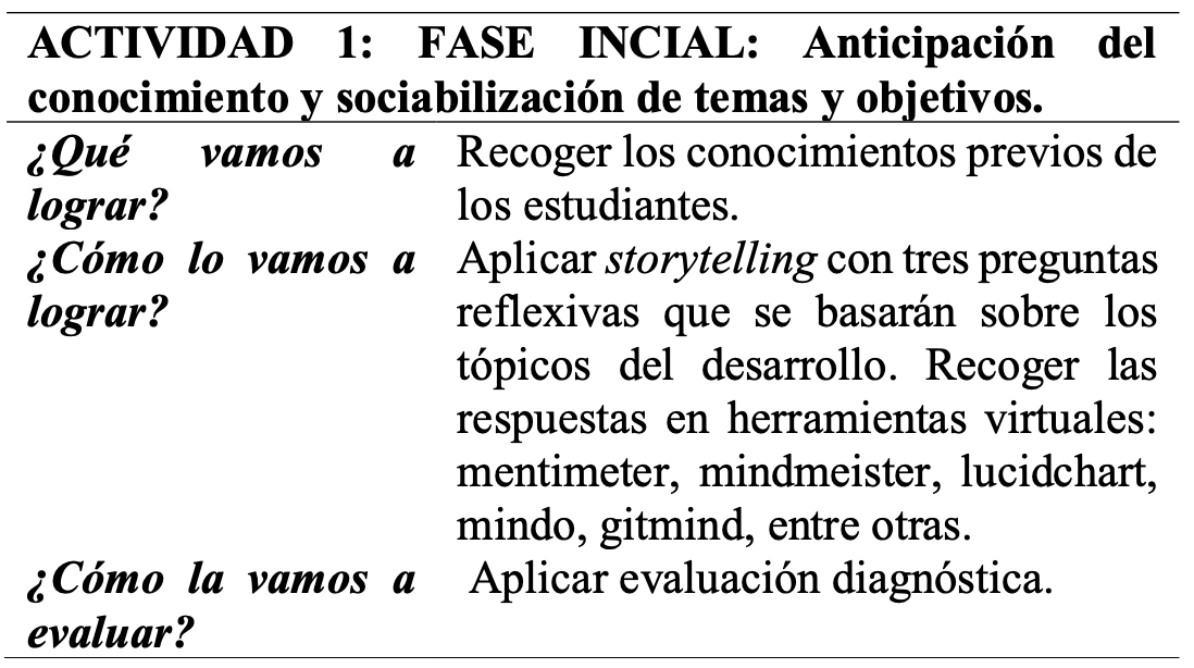 Además, aplicando el storytellingse puede exponer narraciones audiovisuales que lleven a la reflexión, los docentes elaborarán preguntas que recaben en las concepciones previas de los estudiantes frente a los tópicos narrativos que se abordarán en el desarrollo. Este tipo de anticipación compromete al estudiante tanto a recabar en sus concepciones previas como a despertar el interés sobre lo que se abordará más adelante.
