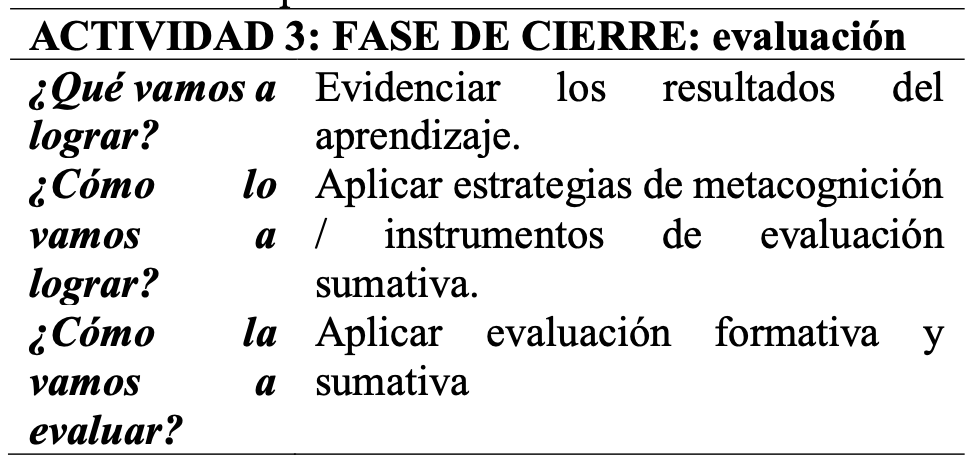 En la tercera fase se sintetiza y se pone en evidencia los resultados de aprendizaje del estudiante, en este sentido adquiere importancia relevante la metacognición que consiste en que el alumno “aprenda a reflexionar sobre la manera de aprender que empleó; que tenga un mayor conocimiento del proceso de aprendizaje que ejecutó; que sea capaz de tener un diálogo interno que le permita autoregularse” (Allueva, 2020). En este sentido, la evaluación aplicada es la formativa.