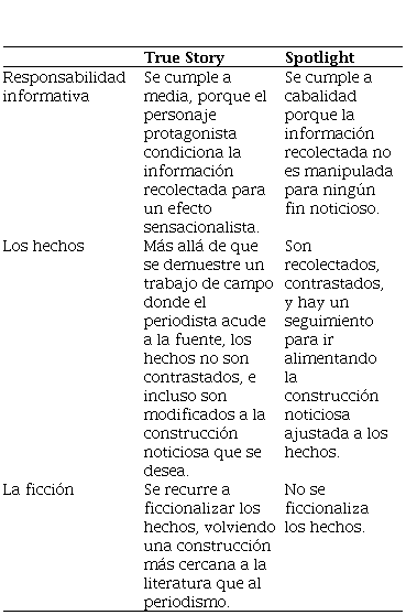 A partir de Spotlight y True Story se identifica dos modelos de periodistas: los primeros asumiendo una responsabilidad informativa desde el medio en el que laboran; los segundos haciendo de sus historias una composición que se ha construido en base a la mentira.