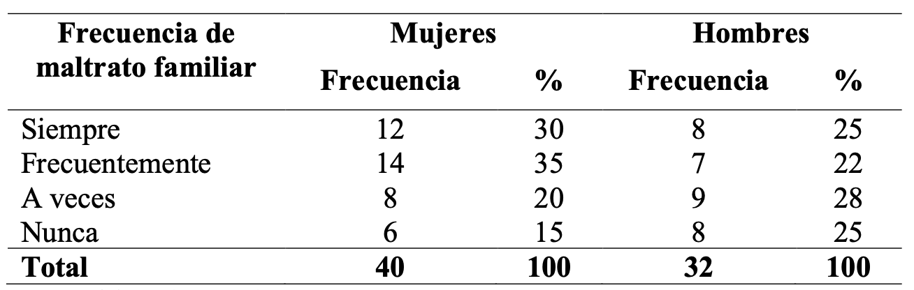 Atendiendo a la frecuencia de maltrato familiar se evidencian diferencias significativas entre ambos sexos. El cuestionario aplicado arrojó que los varones son menos violentados que las mujeres en el ambiente familiar. Los datos concuerdan con la literatura científica publicada a nivel internacional donde las chicas son más violentadas por otros miembros de su familia en comparación con los varones (Carrillo, Juárez, González, Martínez y Medina, 2016). Solo 14 estudiantes afirmaron que nunca reciben maltrato familiar. El dato obtenido se corresponde con los altos índices de maltrato registrados en Latinoamérica donde más del 70% de los infantes sufren de abusos por parte de la familia (Calderón, Santana, Riveros y Borbón, 2019).