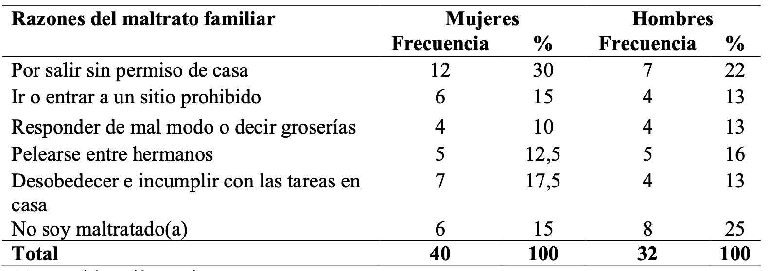 Respecto a las razones del maltrato familiar se identifica una mayor frecuencia el sexo femenino. Contradictoriamente se ha reconocido tradicionalmente “que los varones tienen mayor nivel de conducta antisocial” (Arias, 2013, p. 29). El aspecto que más destaca resulta “por salir sin permiso de casa”, lo que coincide con el desconocimiento de la autoridad filial producto de un esquema disfuncional. En cuanto a la diferenciación entre agresión verbal y agresión física existe una marcada diferencia. En el caso de los varones biológicamente existe una predisposición a la violencia, tienen mayor cantidad de testosterona, estos evidencian mayor agresividad que las mujeres (Rivera y Cahuana, 2016). No obstante, en las mujeres se evidencia una mayor tendencia a la agresión verbal, ya que son quienes presentaron mayores niveles de hostilidad y rechazo.
