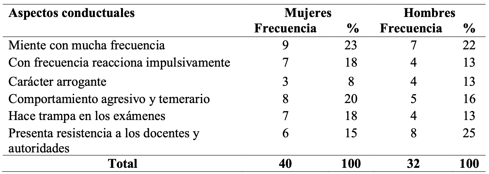 Las expresiones de los aspectos conductuales presentan mayor frecuencia en los hombres. Socialmente instituido se ve con una mayor aceptación a los hombres envueltos en violencia, y debido a los estereotipos de género el papel de la mujer se presenta como un ser sometido y victimizado (Fernandez, García, Hernández y López, 2018). En cuanto al comportamiento agresivo o temerario se demuestra un mayor porcentaje a las mujeres, como consecuencia que deben imponerse mediante la hostilidad hacia otros miembros del colegio.